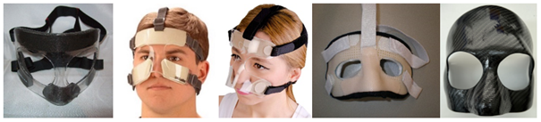 (Mueller broke nose mask (2x), Morsa broke nose mask, model opmaat via gipskamer, ROST opmaat masker)